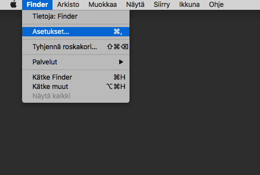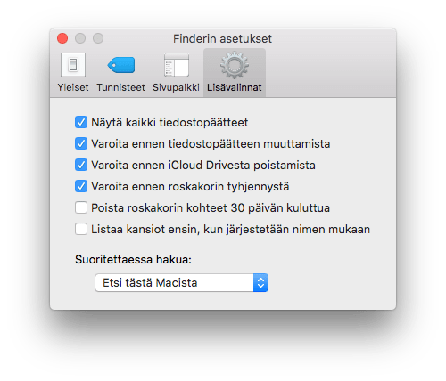 Työpöytä > Finder > Asetukset > Lisävalinnat (Näytä kaikki tiedostopäätteet päälle)