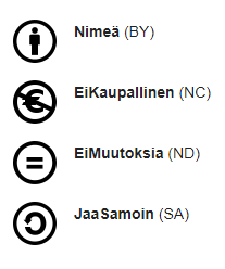 - SA – Annat muiden julkistaa omasta teoksestasi muokattuja teoksia vain samalla lisenssillä, jolla oma teoksesi on julkaistu.